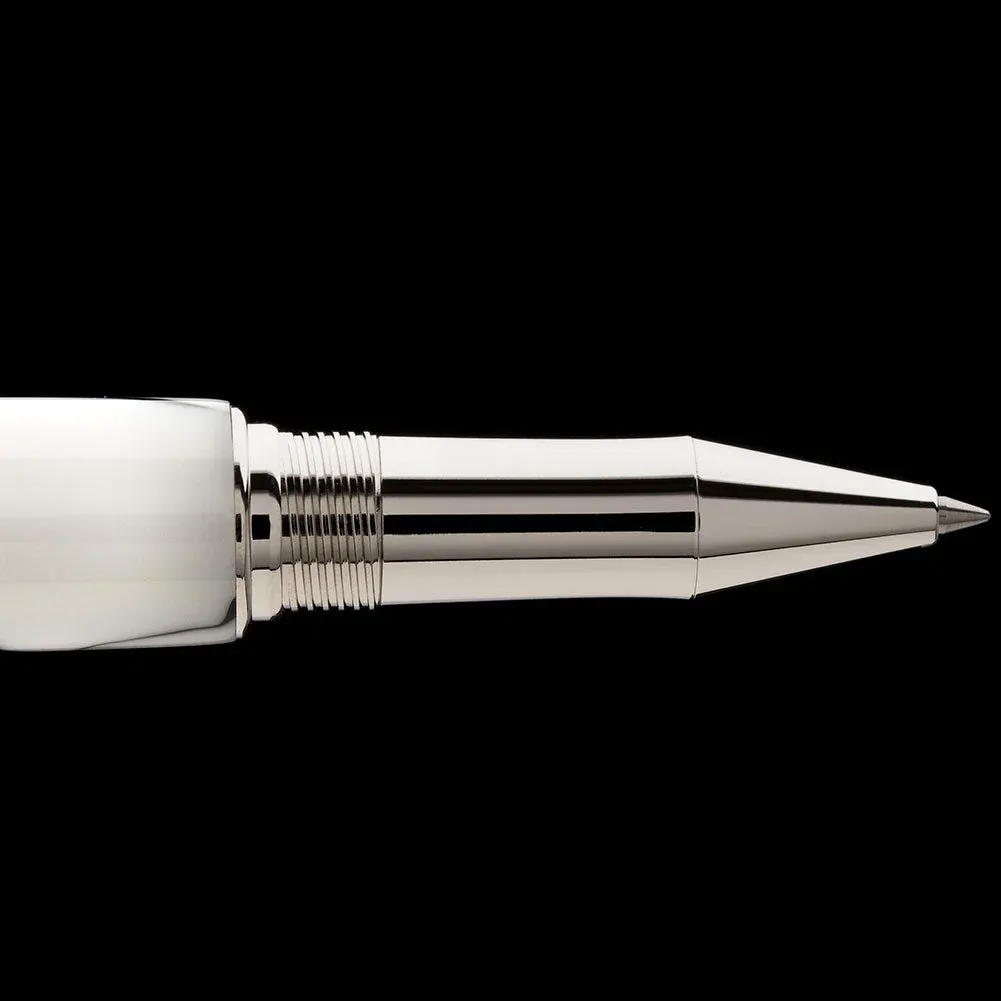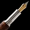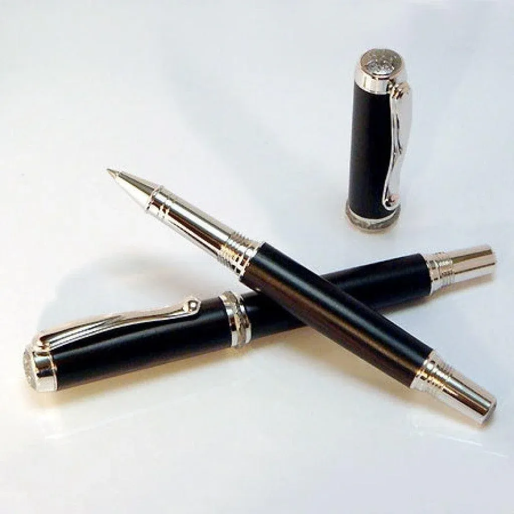 The fountain pen has a German-made two-tone nib with iridium point and a premium fountain ink refill cartridge. The rollerball has a Quality rollerball refill